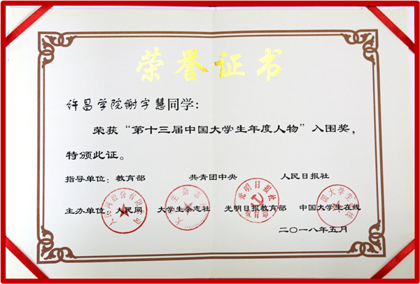 近日,由教育部、共青团中央、人民日报社共同指导,人民网、大学生杂志社、光明日报教育部和中国大学生在线联合主办的“第十三届中国大学生年度人物评选”结果揭晓,经过学校推荐、通讯评审、网络展示和会议终评等环节,我院谢宇慧同学荣获“第十三届中国大学生年度人物”入围奖(全国200强)。