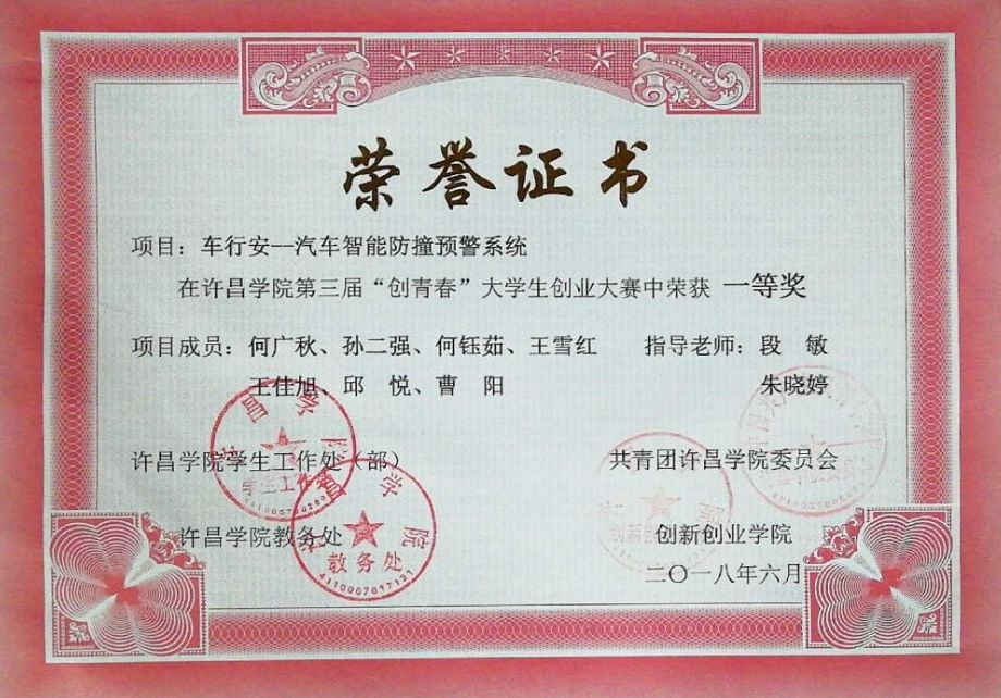 在许昌学院第三届“创青春”大学生创业大赛中,经过信息工程学院(软件职业技术学院)师生共同努力,最终获得佳绩。其中由段敏老师,朱晓婷老师指导,何广秋同学带领的项目《车行安—汽车智能防撞预警系统》荣获一等奖,孟耀伟老师指导,陈琳同学带领的项目《易农APP》荣获二等奖。