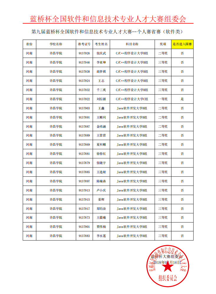 2018年4月1日,由工业和信息化部人才交流中心、教育部就业指导中心联合举办的第九届“蓝桥杯” 全国软件和信息技术专业人才大赛(河南赛区)比赛在和河南大学赛点举行。我院42名学子参赛近日,从第九届“蓝桥杯”全国软件专业人才设计与创业大赛组委会传来喜讯,我院学子在河南赛区比赛中成绩优异,共有21名同学获奖,其中一等奖1名,二等奖6名,三等奖14名,获奖质量再上新台阶。其中获得省赛一等奖的刘棕源同学将代表学校参加5月26日在北京举行的全国总决赛,与全国高校学子同场竞技争夺最高荣誉。