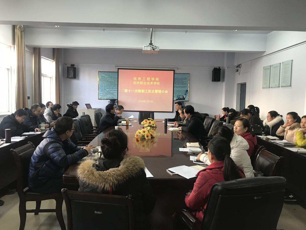 1月9日下午,信息工程学院(软件职业技术学院)第十一次教职工民主管理大会经过认真筹备,报经校工会批准,在315会议室举行。院党政领导班子成员出席会议,全院教职工参会,副书记梁衡主持会议。本次大会主要议题是审议并通过《两院2017年行政工作报告》、《两院2017年工会财务工作报告》。
