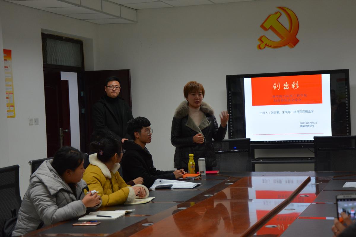 为了培养学生的创新精神、创业能力和创造意识,更好地组织大学生参与“创青春”大学生创业大赛,响应习近平总书记提出的全面践行创新驱动发展的理念。12月6日晚,信息工程学院与商学院共同开展的“创青春”培训交流大会于文科综合楼1312教室举行,本次培训由项目导师杨孟学老师主讲,信息工程学院团总支副书记朱晓婷和商学院团总支副书记张志豪及两院参赛队伍代表人员参加。