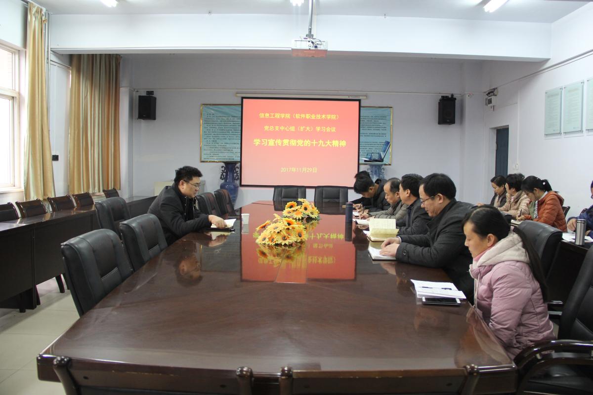 11月29日下午,我院召开党总支中心组(扩大)会议,学习宣传贯彻党的十九大精神,联点领导党委书记闫纪建参会并做了学习指导。院党总支书记张德喜主持会议,院党总支委员、信息化管理中心负责人、各党支部书记和教师代表参加会议。