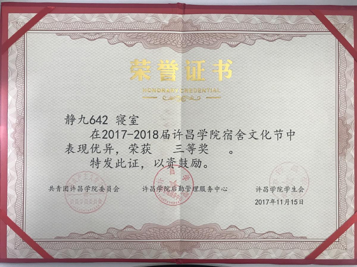 本次宿舍文化节活动中,全校共有10个宿舍脱颖而出,被评为校级“优秀宿舍”称号,这次活动将寝室建设与文化建设相结合。整洁的地面,整齐的被子,摆放有序的物品,有创意的装饰,和谐的气氛,无不彰显着我校学生高昂的热情和充满创新的思维。我院静庐九号642寝室,在这次评比中荣获了第三名的好成绩。