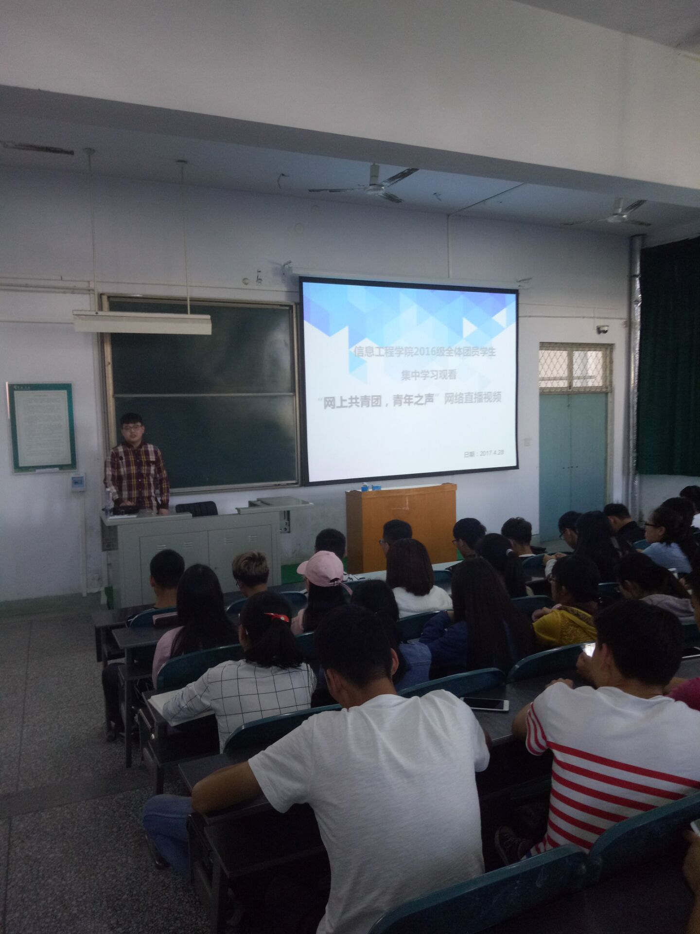 因学生较多,本次学习观看活动在两个教室内进行,计算机科学与技术专业和数字媒体技术专业的学生在A合18教室,网络工程专业和物联网工程专业的学生在A合19教室。信息工程学院(软件职业技术学院)团学会主席郭天泽、主席助理高棒、组织部负责人分别向在场同学简述了“青年之声”互动社交平台自建立以来所取得的巨大成就。播放过程中每位同学都认真的观看聆听此次直播,并记下重要的发言和自己的感悟。在活动之后,团学会主席郭天泽同学提醒大家“五一”假期期间的安全事宜.并祝大家五一快乐.