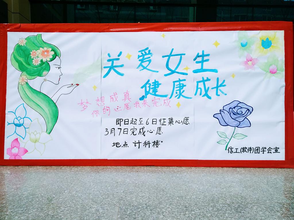 我院于3月6日在计科楼门前举办“关爱女生,健康成长,你的心愿我来达成”活动,活动从即日起到7号结束。在女生节这个特别的日子,希望所有的女孩都能自信、乐观、勇敢地去追寻属于自己的梦想!希望所有的女孩都能为自己骄傲,成为自己想成为的那个人!