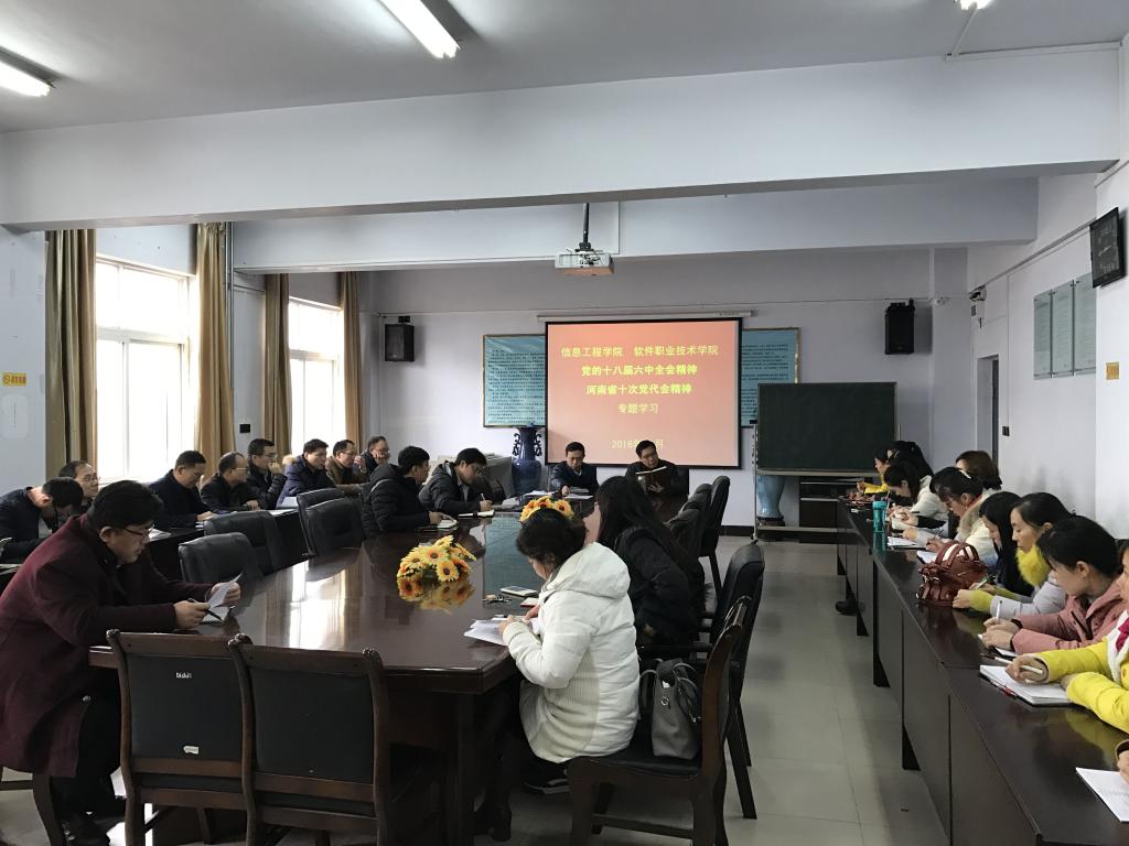 会议首先传达学习了《中国共产党第十八届中央委员会第六次全体会议公报》、人民日报社论《坚定不移推进全面从严治党》和河南省委书记谢伏瞻同志在省十次党代会上所作的题为《深入贯彻党中央治国理政新理念新思想新战略,为决胜全面小康让中原更加出彩而努力奋斗》的报告。张书记强调,作为高校教师,一定要结合“两学一做”学习教育及省委巡视组整改要求,进一步增强“四个意识”,思想上、行动上同以习近平同志为核心的党中央保持高度一致,将会议精神融入日常教学、科研工作、学习实际,扎实推进学院各项工作在“十三五”期间迈向新台阶。