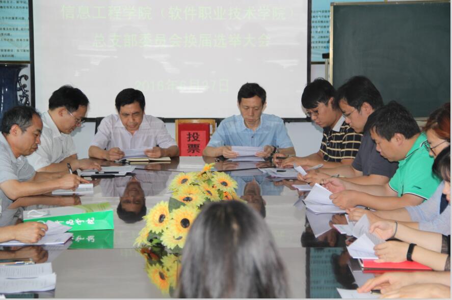 经信息工程学院(软件职业技术学院)党总支委员会研究,报校党委批复,2016年6月27日下午,信息工程学院(软件职业技术学院)党总支委员会换届选举大会在信工315会议室召开。院党总支书记张德喜、副院长(主持工作)杜根远、党总支副书记梁衡、副院长胡子义、平源、信息化管理中心主任冯战申、副主任张玲出席大会,信息工程学院、信息化管理中心教工党员及学生党员53人参加了大会,会议由副书记梁衡同志主持。