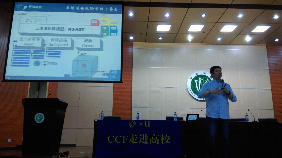 应信息工程学院邀请,2016年5月20日“CCF走进高校”活动来到许昌学院。中国计算机学会常务理事、启明星辰首席战略官潘柱廷教授在学术报告厅作了题为《如何夺得网信和网安的“爵位”》报告。科技处处长张志立、特聘教授朱贵良和200余名师生参加了报告会。此次报告会由信息工程学院副院长平源主持。