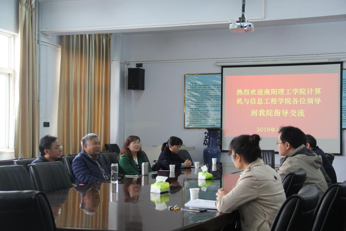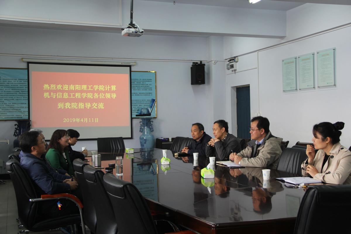 4月11日,南阳理工学院计算机与信息工程学院杜跃鹏副院长等一行到我院考察交流工作。院长杜根远,副院长胡子义、平源热情接待了客人,相关专业负责人和教师参加了座谈交流。