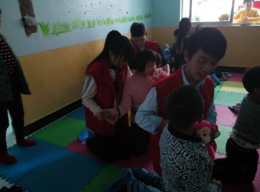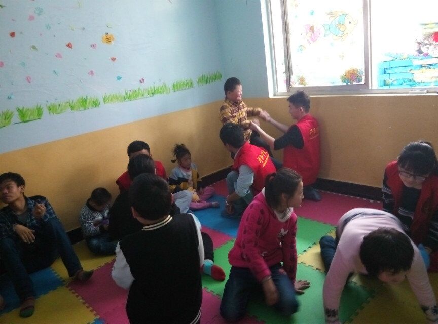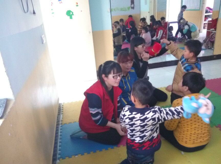 当孩子们下课的时候,志愿者们来到孩子们上课的教室,,当询问老师后得知孩子们刚做完康复练习,可以与孩子们互动来巩固练习成果的时候,志愿者们便纷纷与孩子们打成一片。志愿者把毛绒玩具给孩子们分发下去,小孩子看到这些小玩具也立即活泼起来;时间一点一点的流逝,到了接近四点的时候,孩子们将要放学了,康健园的老师建议大家一起做游戏来更好地互动。并让孩子们给志愿者们演唱新学的儿歌《小燕子》稚嫩的脸庞,嘹亮的歌声,许多志愿者不自觉地跟着唱起来。