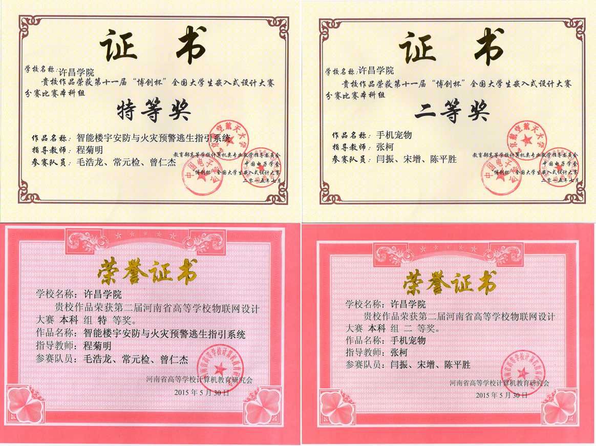 2015年5月30日,第十一届“博创杯”全国大学生嵌入式设计大赛(河南赛区)暨第二届河南省高校物联网设计大赛在郑州轻工业学院举办。来自省内高校的近20支队伍参赛。我校共派出2支代表队参加了本次比赛并获佳绩。由程菊明老师指导,毛浩龙、曾仁杰、常元俭三位同学设计的作品“智能楼宇安防与火灾预警逃生指引系统”获得了河南省赛区本科组特等奖;由张柯老师指导,闫振、宋增、陈平胜三位同学设计的作品“手机宠物”获得河南省赛区本科组二等奖。获得特等奖的团队将于7月份首次代表学校参加在北京举行的全国总决赛。