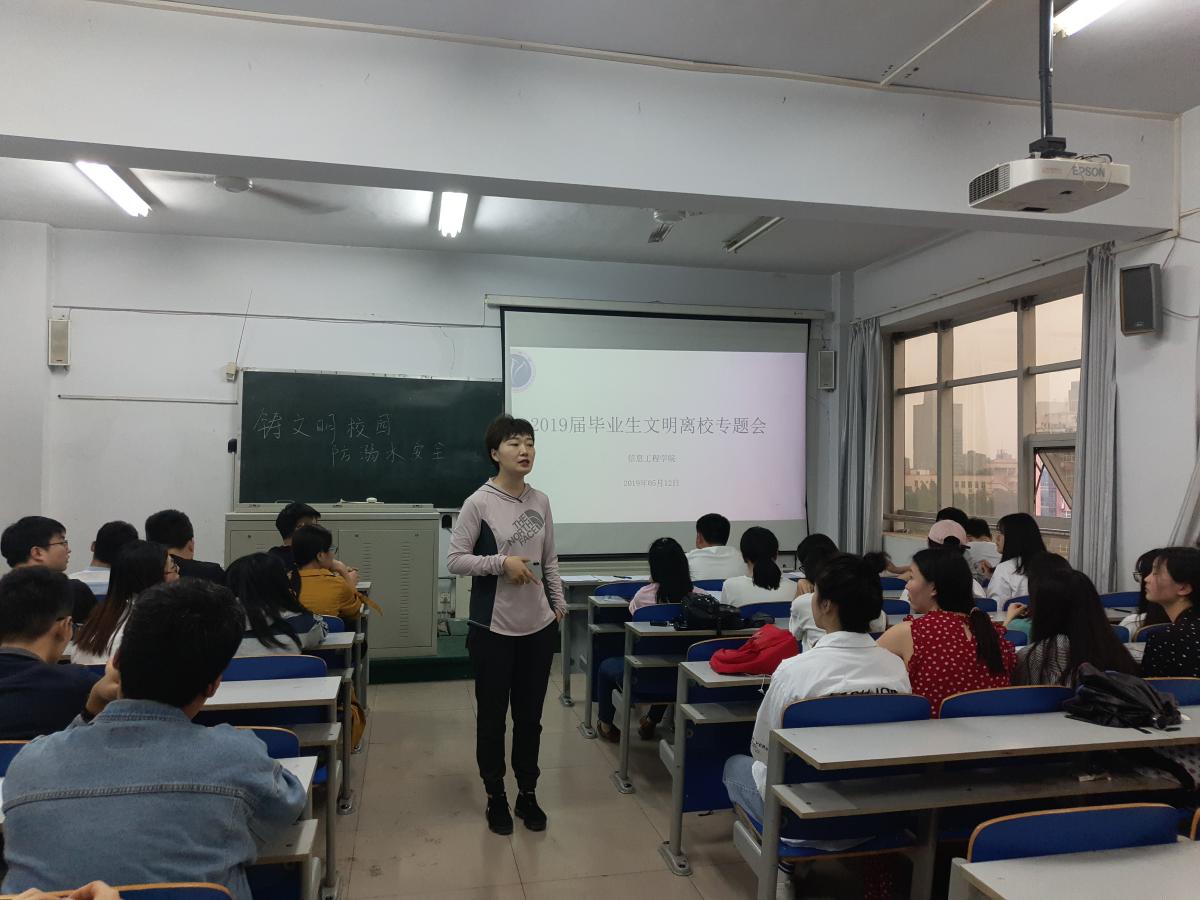 5月12日在信工楼604召开了毕业生安全教育与文明离校专题会。我院辅导员朱晓婷老师主持会议,全体毕业生参会。会议主要包括考试诚信、校规校纪、校园生活安全、实习出行安全等注意事项等内容。并针对学分制度、重修、毕业设计等与学生切身利益相关的内容进行了讲解。同时,朱老师结合案例向同学们重点介绍了安全方面的骗局及如何自我保护。