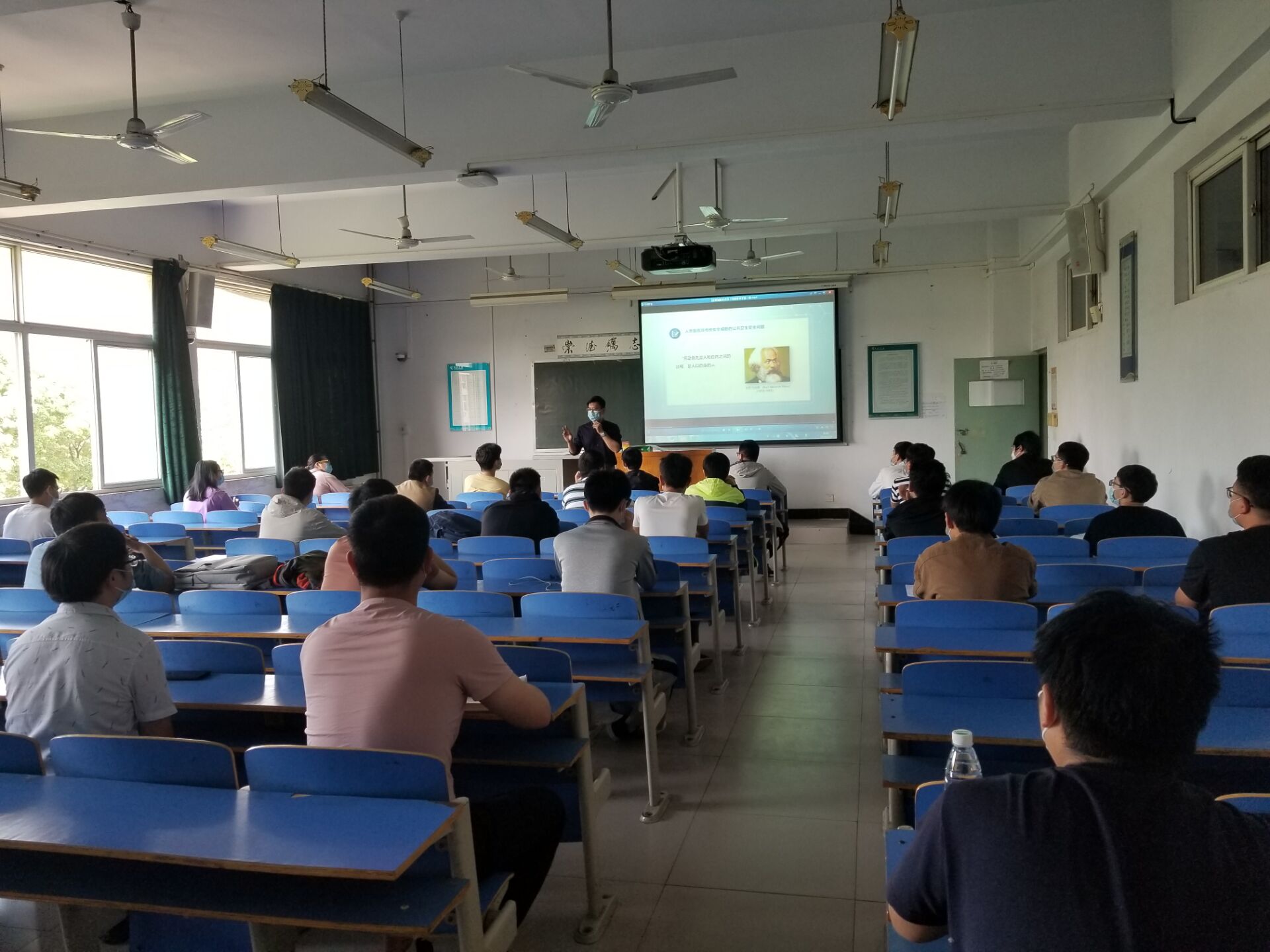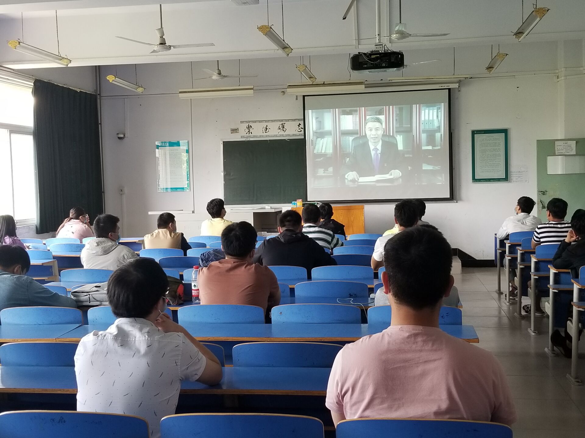8时30分,在C307、308教师,我院第一批返校的学生按照不少于1米的座位间隔同上“返校复学第一课”。他们通过观看校领导和师生代表视频,从不同角度分享解读习近平总书记关于打赢新冠肺炎疫情防控阻击战的重要指示和决策部署、学校统筹疫情防控和教育教学建设工作总体情况,共同守护生命健康,厚植家国情怀;通过观看由省教育厅统一录制的全省高校“返校复学第一课”微课视频,开展实操演练活动,举办以“控制传染源、切断传播途径”为主题的专题讲座,进一步熟知了防疫相关知识,提升了防控技能;通过特色活动共同观看学习政论片《雄关》、开展主题班会活动和同唱爱国歌曲《我和我的祖国》,进一步凝聚起了众志成城共克时艰的力量。