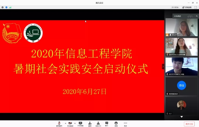6月27日下午,我院2020年大学生暑期社会实践启动仪式暨安全培训会在线上举行。信息工程学院团总支副书记朱晓婷,带队指导教师代表孙鹏、魏夏兰和全体队员参加了本次线上会议。会议由学生团总支副书记赵航主持。