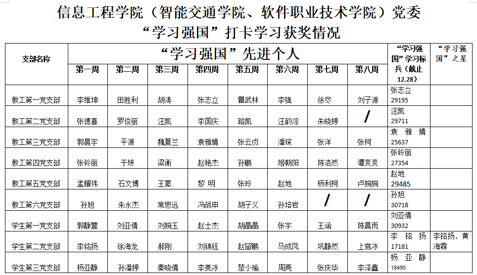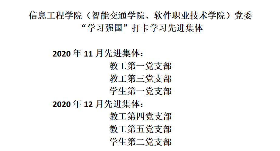 为进一步推动“学习强国”学习平台使用效果,加强平台的组织领导和工作指导,鼓励更多党员、群众加入学习队伍,我院出台了《信息工程学院(智能交通学院、软件职业技术学院)“学习强国”学习平台管理规定》,于2020年11月至12月组织开展了“学习强国”先进典型评选活动。