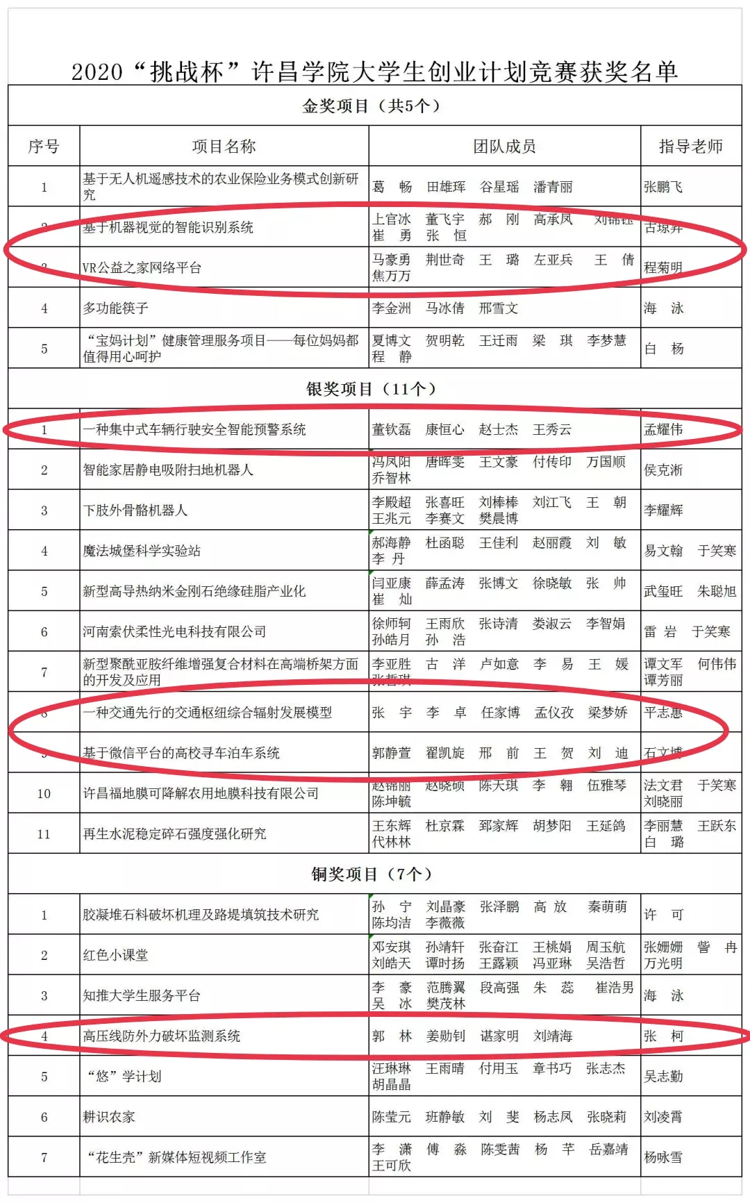 《基于机器视觉的智能识别系统》和《VR公益之家网络平台》项目荣获金奖,《一种集中式车辆行驶安全智能预警系统》、《一种交通先行的交通枢纽综合辐射发展模型》和《基于微信平台的高校寻车泊车系统》项目荣获银奖,《高压线防外力破坏监测系统》项目荣获铜奖。指导老师分别为古琼昇、程菊明、孟耀伟、平志慧、石文博、张柯。