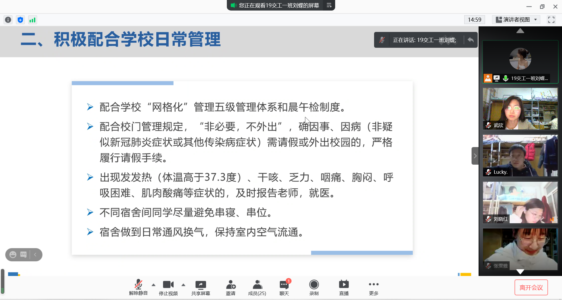 2019级物联网工程 刘秋志:听了朱老师的讲解,我深知生命重于泰山,疫情就是命令!了解到学院在开学阶段的准备工作,我将更加珍惜此次来之不易的开学机会,认真学习,增强本领。