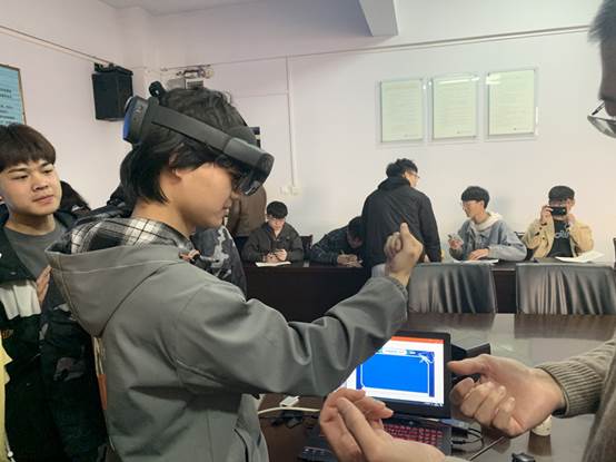 报告后半程,为了加深同学们对VR/AR技术的认知,李红亮分享了企业自主开发的VR、AR、MR相关案例,通过AR设备提高与会人员的科技体验感,让一部分师生体验了虚拟现实技术,感受现代科技的魅力。
