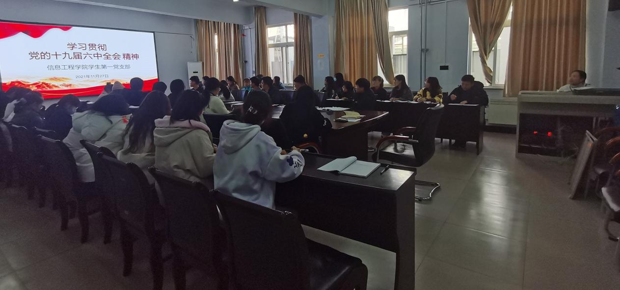 11月27日中午,我院学生第一党支部在信工楼315会议室召开支部大会,本次会议共有两项议题:一是学习贯彻党的十九届六中全会精神;二是讨论接收陈志强等21名同学为预备党员。会议采用线上线下相结合的方式进行,支部全体党员以及21名发展对象参加本次大会。
