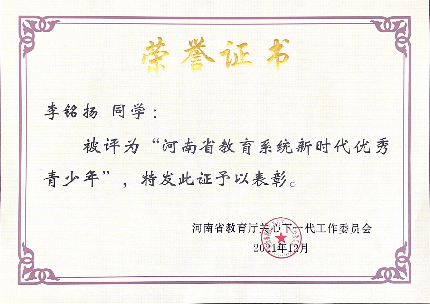 近日,在河南省教育系统关心下一代工作表彰中,我院关心下一代工作委员会荣获先进集体,学生李铭扬获评河南省教育系统新时代优秀青少年。