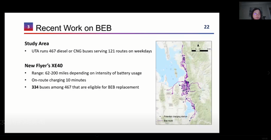 会上,刘晓玥博士讲了三大模块的内容,分别为仅考虑BEB(Battery- Electric Buses)车辆替换和充电站建设总费用最小的情况下如何确定充电站位置、充电站数量和替换的车辆数;考虑BEB(Battery- Electric Buses)车辆替换、充电站建设总费用最小和环境公平性下如何确定充电站位置、充电站数量和替换的车辆数;如何合理确定电动车辆的充电需求。通过模型建立、优化与求解,输出充电站的位置、充电站数量、需要替换掉的车辆数等决策结果,研究成果能够帮助公交机构确定BEB系统的最优部署。通过创新性地的将出行信息和城市信息相结合,能够更加准确地预测电动车辆的充电需求。这些成果对于我国汽车电气化背景下带来的各种运营问题也有很强的指导性。