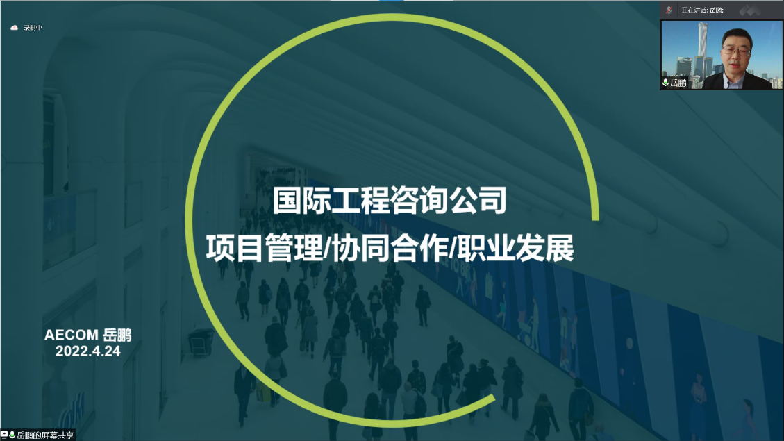 2022年4月24日上午,应我院长江学者于雷教授邀请,AECOM中国区交通规划总监岳鹏先生作题为“国际工程咨询公司交通项目的实践与经验”的专题讲座。讲座由南京市城市与交通规划设计研究院工程师龚大鹏先生主持,采用腾讯会议、微信直播进行,我院交通工程、交通设备与控制工程专业的本科生以及交通大数据挖掘与服务应用学科方向的教师参加了讲座。