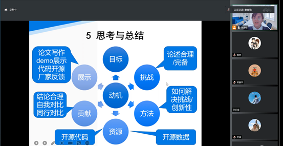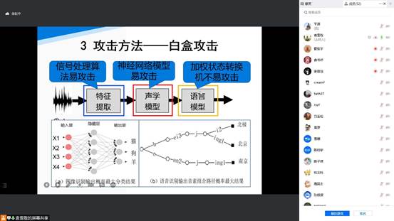 针对智能语音系统的安全问题,袁雪敬博士从对抗攻击技术的角度,首先介绍了对抗样本的含义、攻击场景、攻击效果评估方法;其次,具体讲解了白盒攻击和黑盒攻击的攻击原理、攻击流程、实验效果,并对在数字与物理环境下的攻击有效性与隐蔽性进行了讨论;然后,从随机化/降采样、训练分类模型、模型自身提升三个方面介绍了对抗攻击的防御方法;最后,总结了对抗攻击的具体研究方法和今后的研究方向。参会老师和学生就对抗攻击中不同语种的识别、语音识别中的噪声问题、防御方法的叠加等技术展开了热烈讨论。