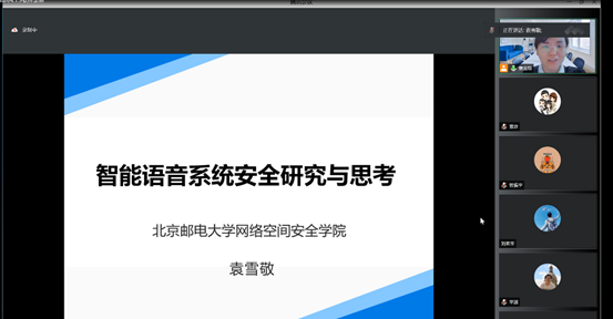 2022年7月4日晚19时,应我院平源教授、曹彦博士的邀请,北京邮电大学软件安全中心袁雪敬博士为学院师生作了题为“智能语音系统安全研究与思考”的前沿学术报告。报告采用腾讯会议线上方式直播,网络与数据安全学科方向全体教师、联培硕士生,信息安全专业、网络工程专业(网络安全方向)及部分已毕业本科生参与了线上交流,报告由副院长平源教授主持。