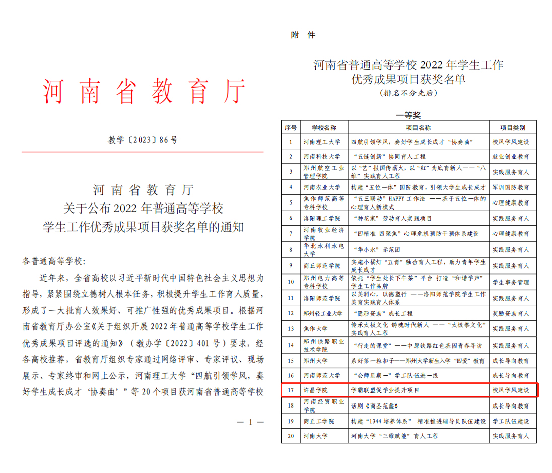 近日,2022年河南省普通高等学校学生工作优秀成果项目评选结果揭晓,我院实施的“学霸联盟促学业提升项目”获一等奖。