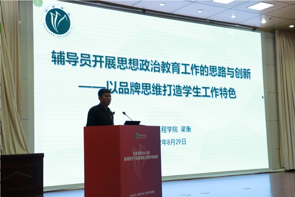 8月29日,院党委副书记梁衡在2022年暑期团学干部素质能力提升培训班做《辅导员开展思想政治教育工作的思路与创新——以品牌思维打造学生工作特色》辅导培训,信息工程学院全体辅导员参加培训。
