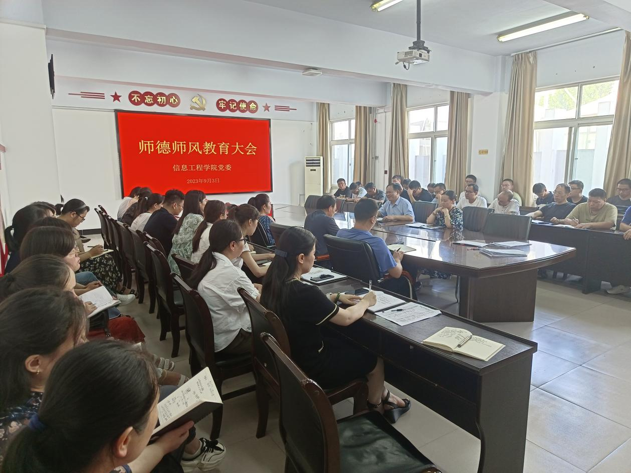 为深入学习贯彻习近平总书记关于教育的重要论述和全国、全省教育大会精神,持续加强和改进新时代师德师风建设,努力建设一支志做“四有”好老师的教师队伍,9月3日下午,我院在信工楼315会议室召开新学期师德师风教育大会,学院全体教职工参加,会议由院长冯战申主持。
