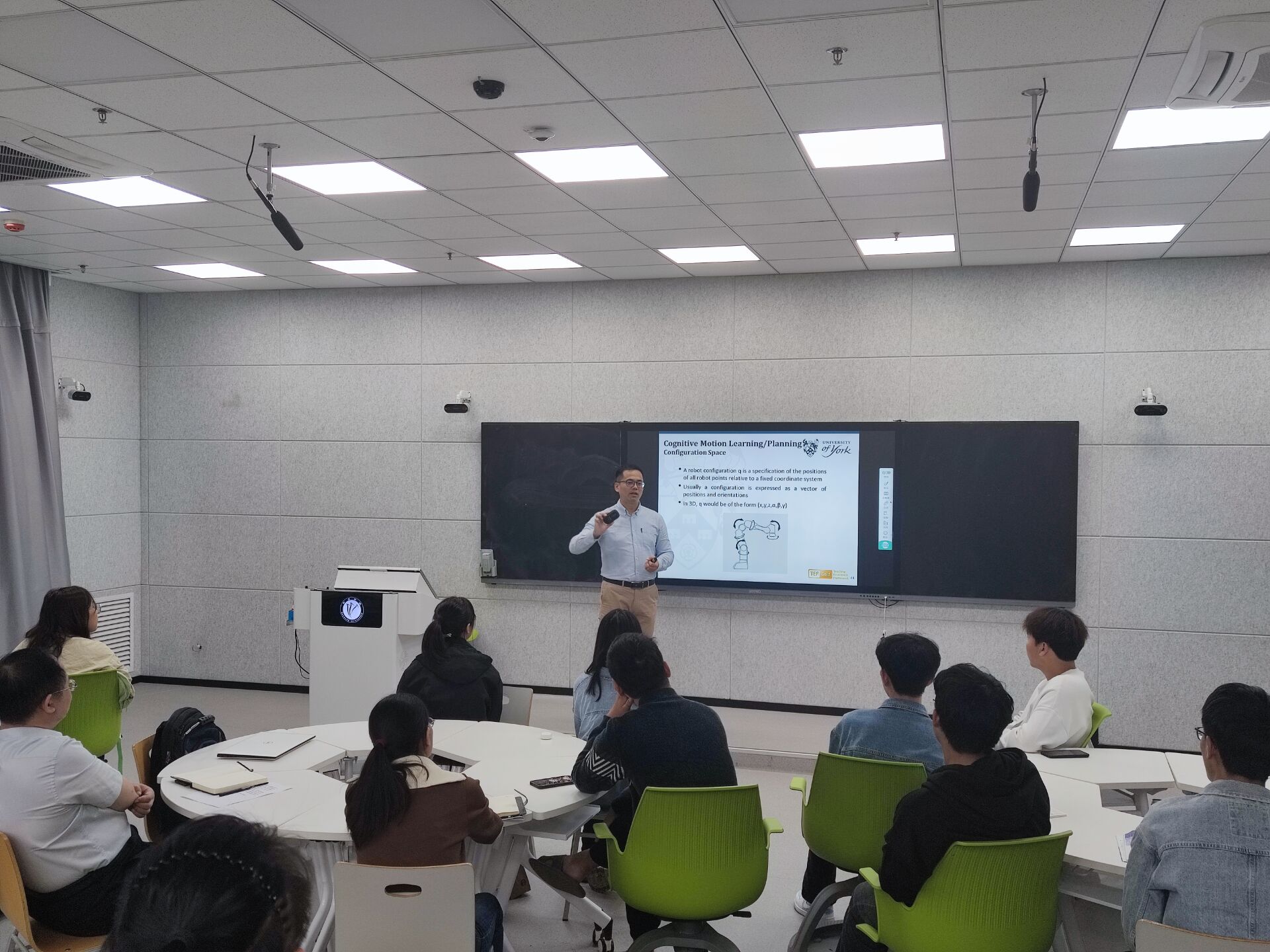 报告会上,刘鹏程简单介绍了约克大学计算机学院的相关情况,深入讲解了机器人和人工智能领域中自驱动仿生软机器人的构建、机器人的认知运动学习和运动规划等问题,通过动画生动形象的展示了研究成果在智能制造、智慧农业、智慧医疗等领域的应用情况,并就光线变化环境下的运动规划、机器人运动中的安全性以及仿生软机器人的构建等问题与参会师生进行了深入讨论。