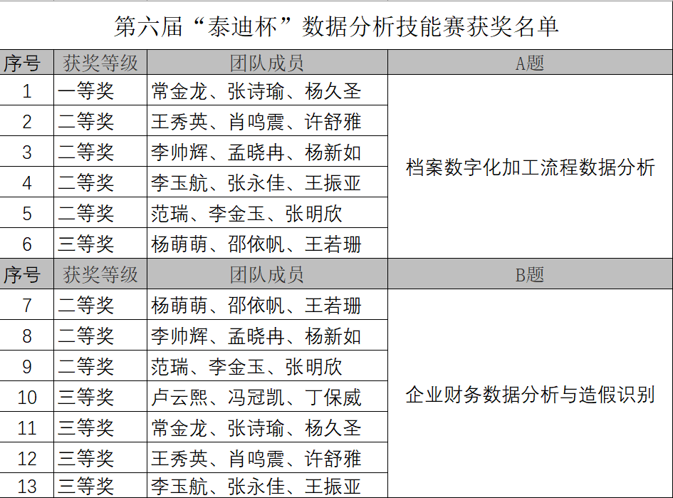 2023年11月11-12日,第六届“泰迪杯”数据分析技能赛落下帷幕,共计有来自全国近300所高校的1638支队伍报名参赛,包括哈尔滨工业大学、南开大学、国防科技大学、北京交通大学、西安交通大学等50多所国内知名高校。我院数据科学与大数据技术专业共组织参赛24名学生,组成8支队伍参与了本次竞赛,经过2天的鏖战,最终斩获一等奖1项,二等奖7项,三等奖5项。