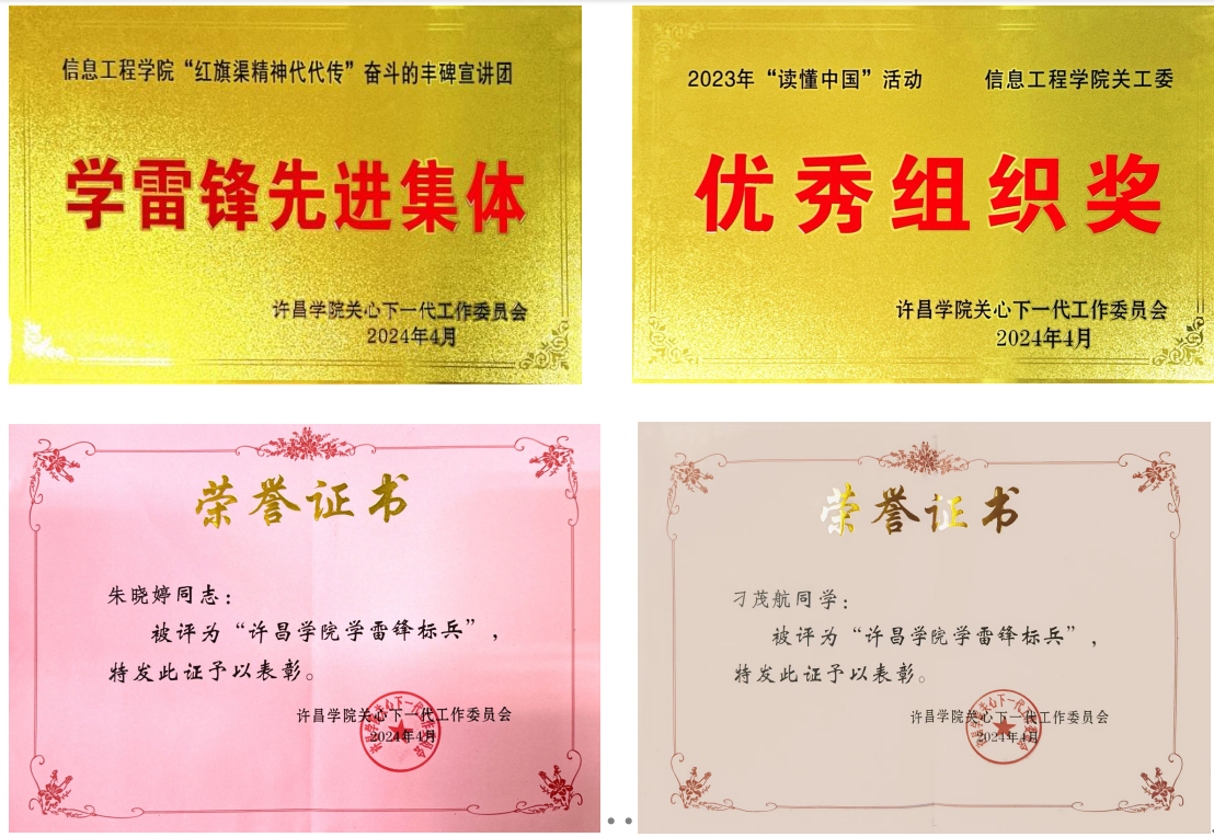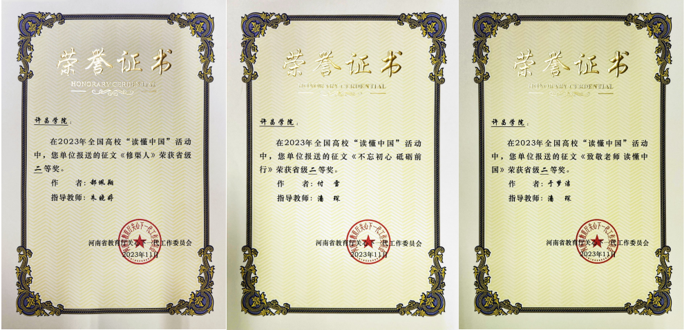 在“读懂中国”主题教育活动中,我院关工委荣获“读懂中国”活动中优秀组织奖;我院推荐的征文作品《修渠人》、《不忘初心 砥砺前行》、《致敬老师 读懂中国》荣获省教育厅关工委征文二等奖;《通过五老读懂中国》、《爱让薪火骤燃时》、《学“五老”精神 绘未来篇章》荣获许昌学院关工委征文一等奖;《五老精神》荣获许昌学院关工委征文二等奖;朱晓婷、潘琛被评为优秀指导老师。