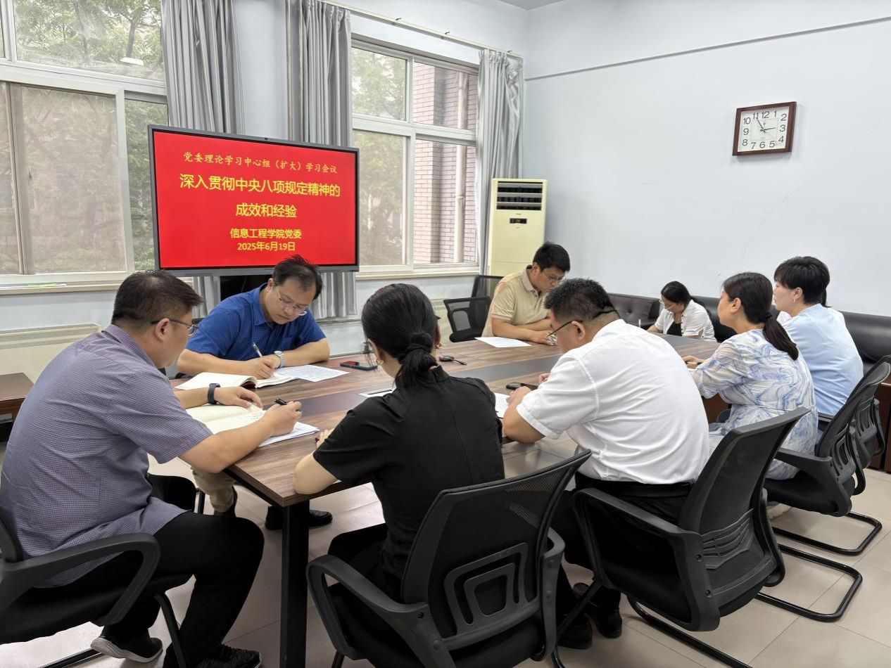 6 月 19 日下午,我院在信工楼 308 会议室召开党委理论学习中心组(扩大)学习会议,围绕“深入贯彻中央八项规定精神的成效和经验” 进行学习讨论。学院党委书记梁衡主持会议,党委理论学习中心组全体成员参会,各党支部书记列席会议。