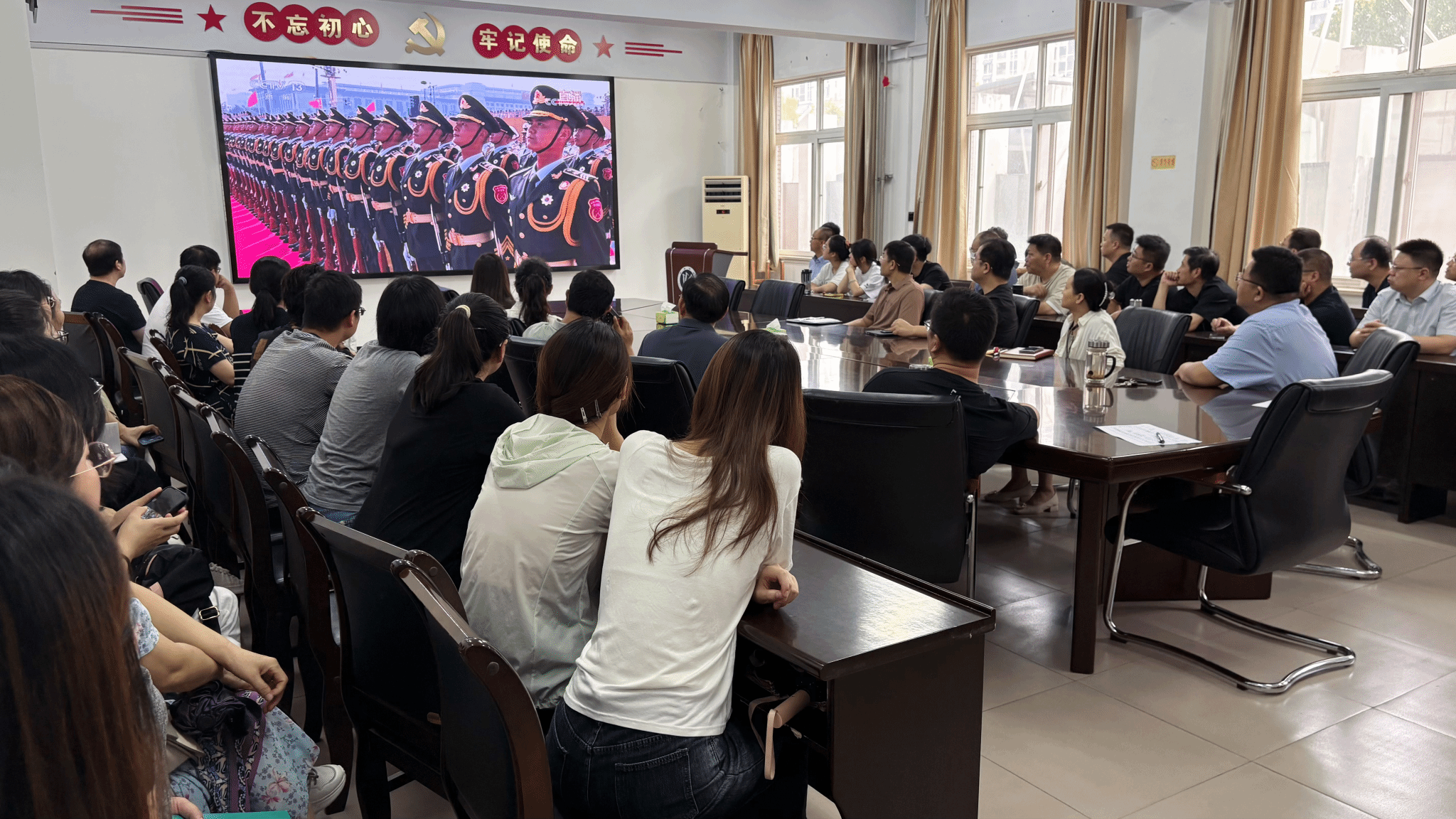 我院积极组织全体教工、学生党员代表在信工楼315会议室集中收看大会直播,共同见证这一庄严时刻。直播过程中,大家认真聆听习近平总书记重要讲话,深刻认识到中国抗战在世界反法西斯战争中的历史地位和重大贡献,体会到中国人民为胜利所付出的巨大牺牲和艰苦努力。阅兵仪式上,整齐的队列、先进的装备依次通过天安门广场,展现了强国强军的崭新面貌,每一个画面都让在场师生深受震撼、倍感振奋。
