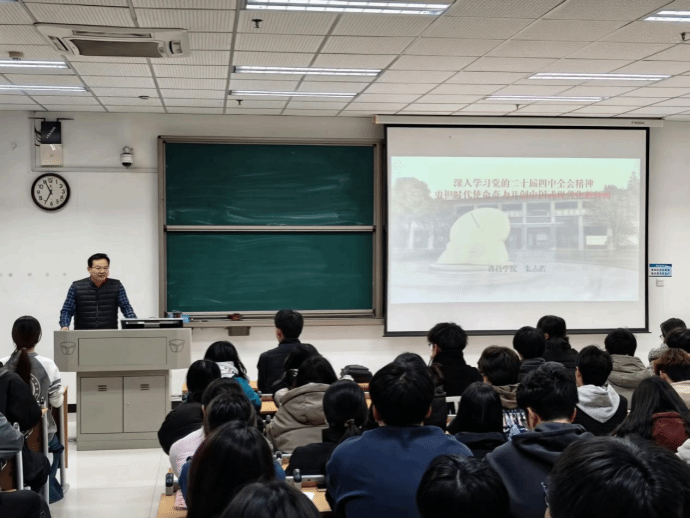 为深入学习贯彻党的二十届四中全会精神,12月8日晚,我院结合分党校培训安排,特邀校党委宣讲团成员朱志浩博士在E318教室开展党的二十届四中全会精神专题宣讲会,学院入党积极分子及学生干部代表共计150余人参会,学生第三党支部副书记张桢主持会议。
