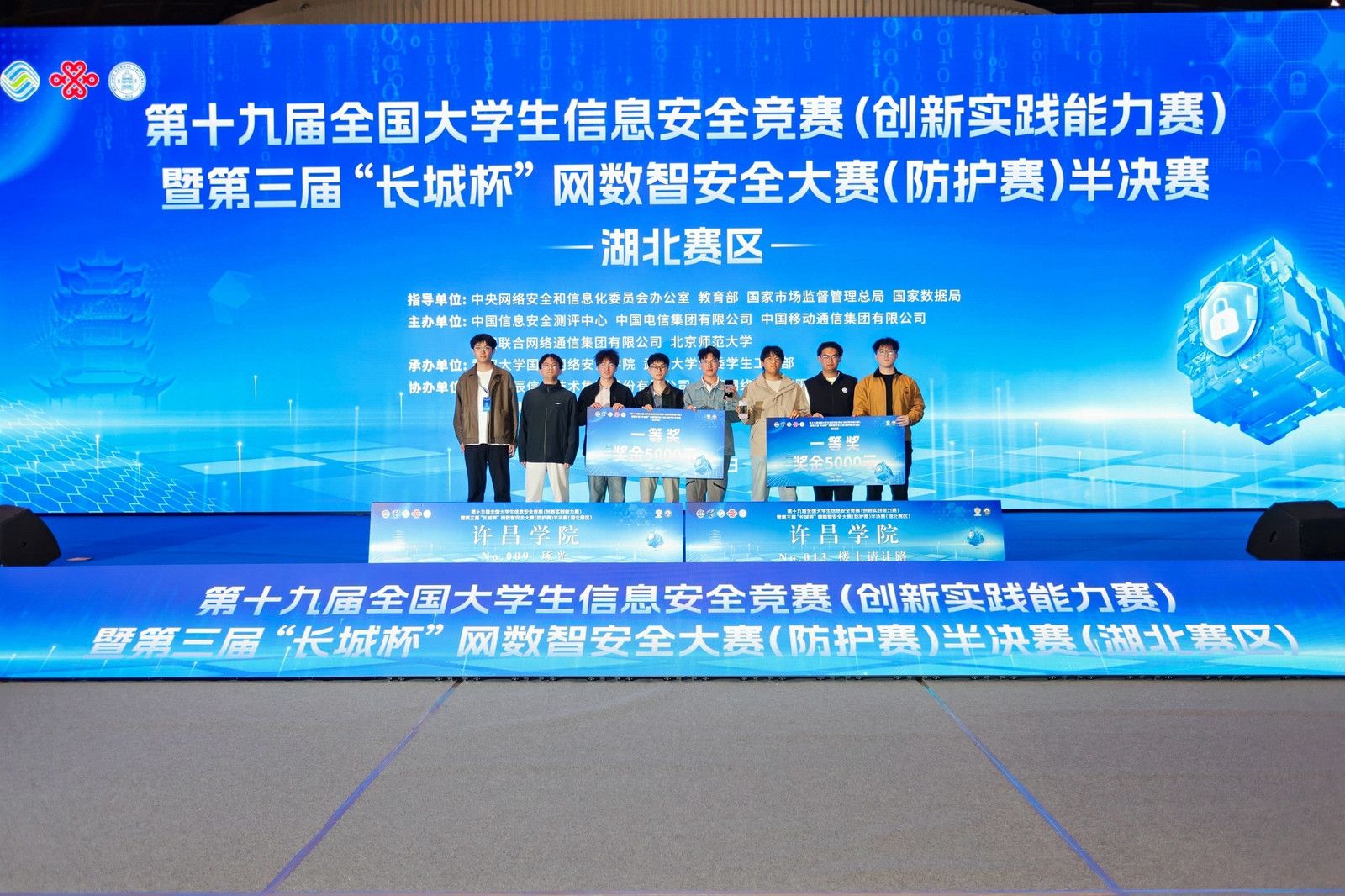 3 月 22日,由中央网络安全和信息化委员会办公室、教育部、国家市场监督管理总局、国家数据局指导,中国信息安全测评中心、中国电信、中国移动、中国联通、北京师范大学联合主办,武汉大学承办的第十九届全国大学生信息安全竞赛(创新实践能力赛)暨第三届 “长城杯” 网数智安全大赛(防护赛)湖北赛区半决赛圆满落幕。我院信息安全专业23级两支学生代表队在本次大赛中双双斩获赛区一等奖。