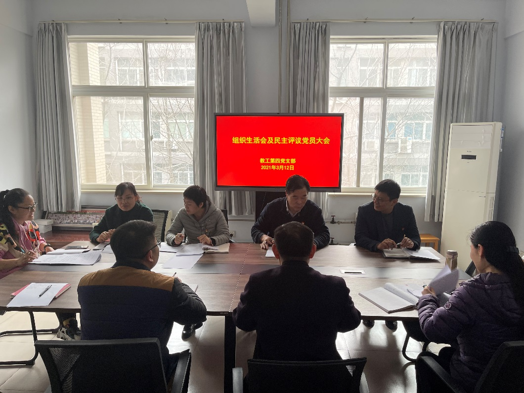 按照校党委组织部《关于召开2020年度党支部组织生活会和开展民主评议党员的通知》要求,3月12日下午,我院教工第四党支部在信工楼308会议室召开专题组织生活会和民主评议党员大会,会议由支部书记于妍主持。