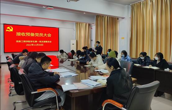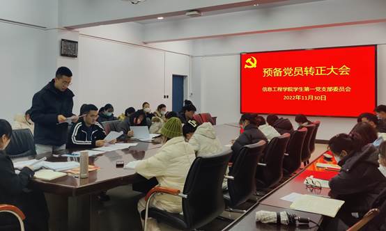 2022年11月30日上午,我院学生第一党支部在信工楼315会议室召开支部大会。本次会议共有两项议程:一是讨论接收高琳等9名同志为中共预备党员;二是讨论马燕燕等16名同志能否按期转为中共正式党员。会议采用线上线下相结合的方式进行。