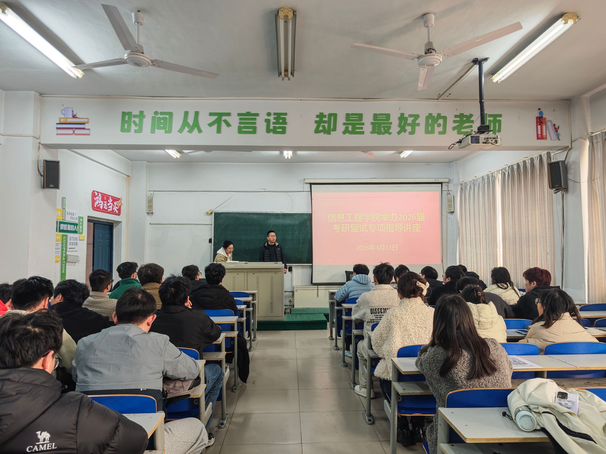 为帮助2026届考研学子精准把握复试要点、明晰调剂方向,增强备考信心与应试能力,3月13日,信息工程学院邀请校外考研指导专家在信工楼604教室开展2026届考研复试专项指导讲座。学院党委副书记王晓霞、毕业班辅导员和全体备战考研复试的学子参加此次讲座。