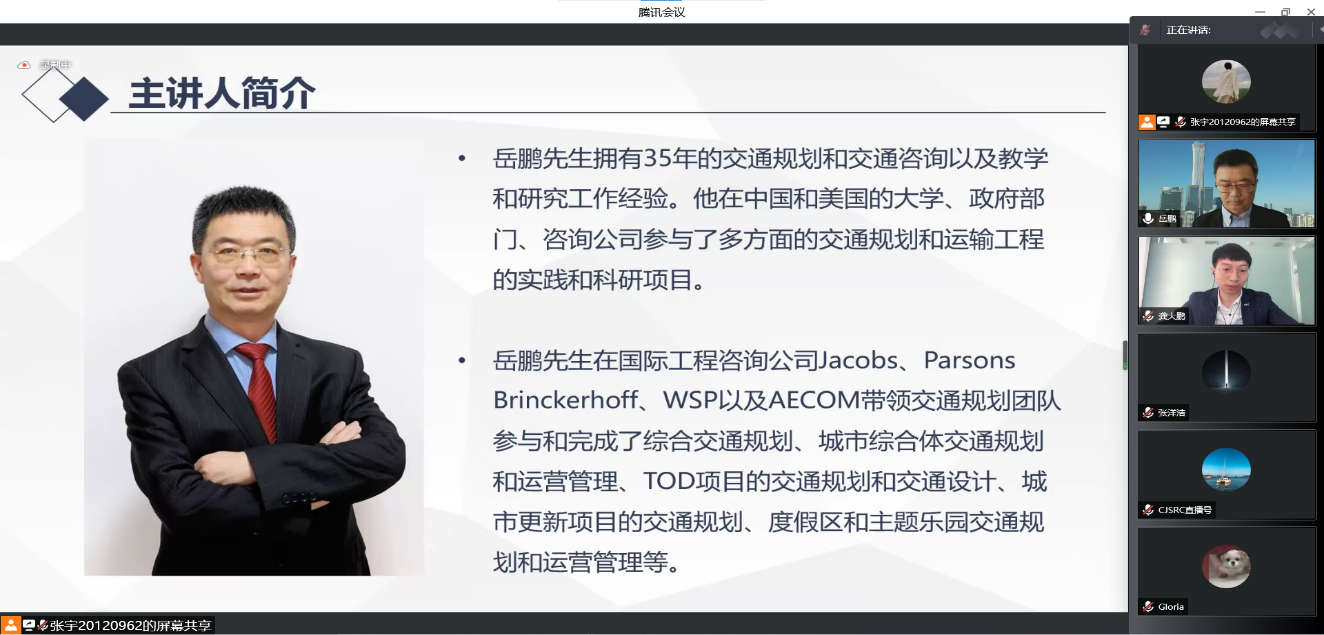 2022年4月24日上午,应我院长江学者于雷教授邀请,AECOM中国区交通规划总监岳鹏先生作题为“国际工程咨询公司交通项目的实践与经验”的专题讲座。讲座由南京市城市与交通规划设计研究院工程师龚大鹏先生主持,采用腾讯会议、微信直播进行,我院交通工程、交通设备与控制工程专业的本科生以及交通大数据挖掘与服务应用学科方向的教师参加了讲座。